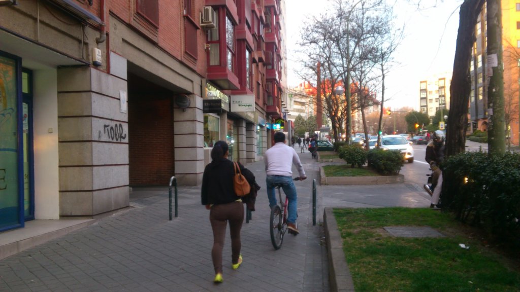 A pesar de existir carriles bici, las bicicletas circulan en las calles anchas por las aceras, indistintamente.